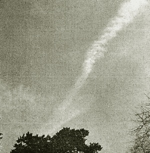 "Gikingi, Kenia. Schnee in Kenia - das kommt nicht häufig vor. Entsprechend groß ist die Überraschung unter den Bewohnern von Gikingi Village, einem kleinen Ort rund 220 Kilometer von der Hauptstadt Nairobi entfernt. Lange wird die Freude aber nicht anhalten, zu schnell ist der nach einem Hagelsturm liegengebliebene Schnee wieder geschmolzen." Die obigen Zeitungsberichte sprechen für sich und bestätigten: das Eis im Weltall. 3) In der Monatszeitschrift "Mitteilungen des Hoerbiger-Instituts" (Band 1 Heft 10/12, September 1940) ist auf Seite 176-177 eine "Beobachtung eines Eiseinschusses" schriftlich und bildlich dokumentiert. Den damaligen Bericht wollen wir hier wiedergeben: "Beobachtung eines Eiseinschusses Eine auffällige Wolkenerscheinung, die mit großer Wahrscheinlichkeit einen kleineren, bereits stark abgebremsten Eiseinschuß betrifft, wurde im Frühling von mir beobachtet. ![]() Abb. 1. Anfang der Einschußwolke im