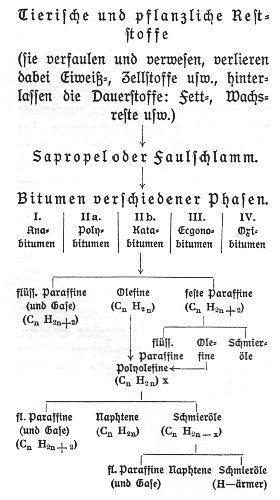 1) Bitumen (lat.) ist die Bezeichnung für bestimmte in der Erde vorkommende brennbare Produkte, hauptsächlich Kohlenwasserstoffe von z. T. teerartigem Geruch, wie Erdöl, Erdwachs, Erdgas usw. 2) H. Höfer: "Das Erdöl und seine Verwandten". (I/1888, II/1906, III/1912). C. Engler: "Die neueren Ansichten über die Entstehung des Erdöls" und "Die Bildung der Hauptbestandteile des Erdöls". Aus: "Petroleum". (1907.) C. Engler und H. Höfer: "Das Erdöl, seine Physik, Chemie, Geologie, Technologie und Wirtschaftsbetrieb." Fünf Bände (1909). H. Höfer: "Die Geologie, Gewinnung und Transport des Erdöls." Band II von: "Das Erdöl usw." (1909.) 3) Potonié: "Die Entstehung der Steinkohle und der Kaustobiolithe überhaupt (wie des Torfs, der Braunkohle, des Petroleums usw)." (1910.) |