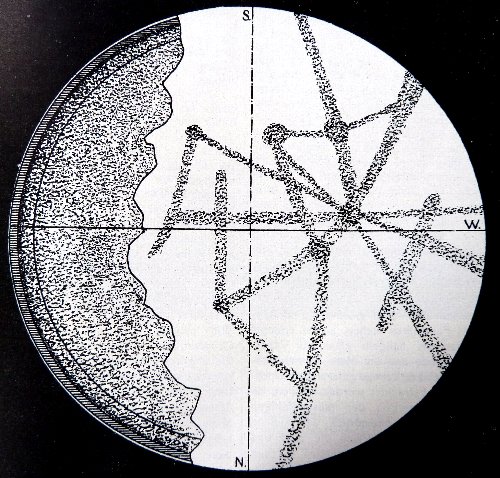 Es ist das jedenfalls nur ein kleiner Bruchteil jener all-mondabendlichen und nächtlichen Rauhreifbildung, die das "Bleichen" der Mareflächen in der Nähe der Schattengrenze bewirkt. Dieser moospflanzenartige Rauhreif erfolgt größtenteils aus dem Wieder-Niederschlag der im größeren Umkreis des Sonnen-Hochstandsortes sich immer wieder vollziehenden Verdunstung und allseitigen Auseinanderschwebung eben dieses Reifes. Wegen dieser Bereifung kommen die (um die Mittagszeit dunklen) Mareflächen bleich aus der Nacht! - Hellweiß können sie trotz dieser Bereifung weder Abends in den Selbstschatten eintreten, noch des Morgens aus ihm herauskommen, weil diese Reifpflänzchen das Abends und Morgens die längsten Schatten werfen, die sich mit dem hellen Weiß der feinen Kristallflächen zu einem des Abends immer dunkler und des Morgens immer heller werdenden Grau vermischen! Je höher aber des