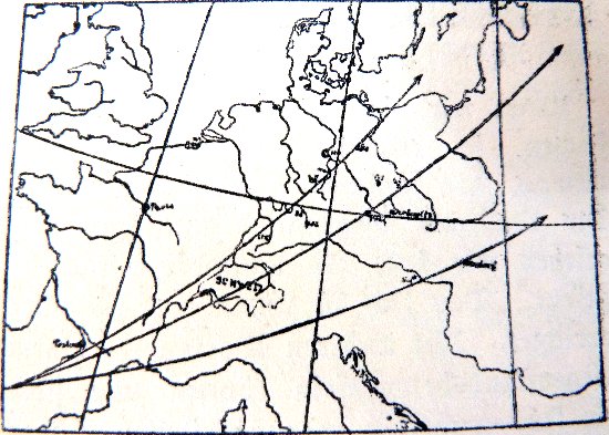 Jeder von diesen drei unheimlichen Gesellen zerbarst natürlich in eine Reihe kleinerer Teile, die eine Streuung auf der Bahn hervorriefen, so daß die Richtungen der einzelnen Unwettern etwas auseinanderweichen. Das kleinste Bruchstück kam zuerst, das größte zuletzt herunter, wie es auch die Zunahme der verheerenden Wirkung nach Nordosten zeigt, und wie es die Gesetze der Mechanik erfordern. Robert Hüttemann (Aufsatz- und Kartenquelle: Monatsheft "Schlüssel zum Weltgeschehen", Heft 1 u. 2, S. 41-45, Jahrg. 1929, R. Voigtländers Verlag-Leipzig) |