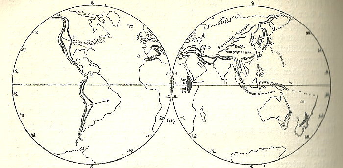 Ganz ähnlich ist die Herausbildung der sibirischen Randgebirge zu deuten. Auch sie sind wahrscheinlich auf mächtige Zerrwirkungen zurückzuführen; doch fällt ihre Entstehung in den Beginn des stationären Stadiums, als die Mondpendelungen noch viel weiter nach Norden und Süden reichten und die (tertiäre) Luna noch das Bestreben hatte, hinter der Erddrehung zurückzubleiben, also über das entstehende abessinische Gebirge nach Westen zurückzusinken. Jedenfalls wird auch die Zugrichtung der Kleinen Sundainseln einschließlich Javas damals seine erste Herausbildung erhalten haben. Als das Ende des