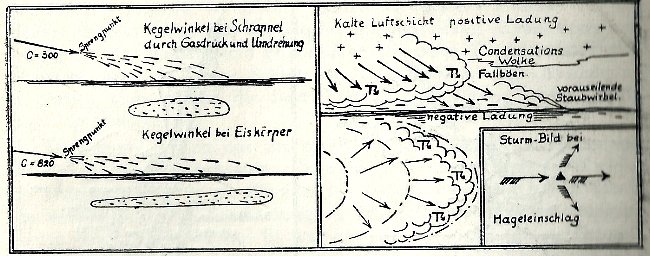 Von der Seite sieht man deutlich, daß unter den seitlich entweichenden, feuchten, also wolkenbildenden Luftmassen nach vorn ein gewaltiger Wulst aufgeworfen wird. Dieser macht sich in unheimlich geballten, dicken Gewitterwolken (Cumulo-Nimbus) bemerkbar. Nach hinten erstreckt sich ein feineres Wolkengebilde, nachgeschleppter Wasserdampf. Kurz gesagt, man sieht, wie durch die Gewalt des Einsturzes die Atmosphäre aufgewühlt und in weitem Umkreise mit Wasserdampf gesättigt wird - und Regen bringt. Das Eis dagegen splittert nur auf schmaler Bahn daher. Daß die nach den Seiten gedrängten Wolkenmassen auch Reibungselektrizität des einstürzenden Eises enthalten, ist selbstverständlich. So hat denn auch die Erscheinung des Gewitters eine größere Breiteerstreckung als der Hagel. Angesichts der von Hagelwettern