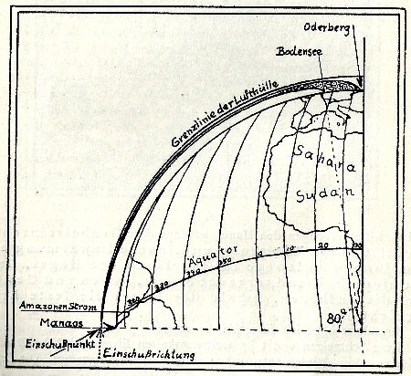 Schnitt durch das Eisschleierhorn, geführt in der Ebene der Großwandelsternbahnen. Grundlegendes Schaubild für die Erklärung des Zusammenhanges der Sonnenflecken, der Großwetterlage, der Ernteerträge, sowie der psychischen und kulturellen Erscheinungen auf Erden mit den Stellungen der Wandelsterne. (Zeichnung von Hanns Hörbiger) III. Darstellung der Hagelwahrnehmung auf der Erdoberfläche. Vom Himmel hoch, da komm ich