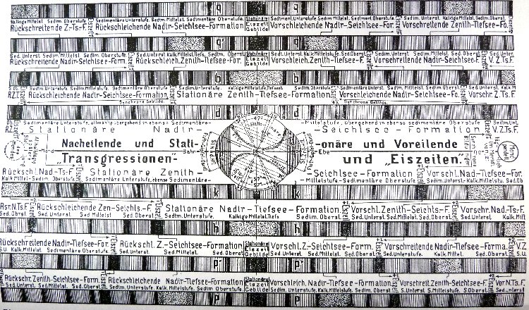 Nach Hanns Hörbiger jedoch werden die Schichten nicht am Grunde des Meeres abgelagert und von dort samt dem Grunde heraufgehoben, sondern das Meer pendelt, der Bewegung des Mondes folgend, über die Kontinente, wobei an den Randgebieten der Fluten Sedimentschichten gebildet werden, die während der Ebbezeit zusammengefrieren. Während des eintägigen Monats, als die beiden Flutberge beinahe feststanden (Bemerk. WEL-Institut: über dem afrikanischen Kontinent) und nur 5 Grad über und unter den Äquator auf- und abpendelten, war nicht nur das Wasser, sondern auch das Luftmeer zusammengezogen worden, und zwar über den Flutbergen in eiförmiger Gestalt. Die Weltraumkälte drang zwischen den Wasserbergen immer mehr gegen den Äquator in die unter geringem Luftdruck liegenden Breiten vor, und die Vereisung der Erde war, mit Ausnahme der unter höherem Luftdruck liegenden Flutberggebiete, vollständig geworden. In den mittleren und höheren Erdbreiten, über welche die Ebbe-Ausläufer der pendelnden Flutberge noch hinüberrauschten, herrschte also eine unausdenkbare Kälte. Die von den Flutbergen bis fast zu den Polargegenden geschleuderten Wassermassen konnten daher zum Teil nicht wieder zurückfluten, sondern blieben glattgefroren auf dem Ebbegebiet liegen. Dabei führten diese Ebbeausläufer nicht etwa klares Ozeanwasser mit sich, sondern eine Schlammbrühe, gemischt mit Geröll und Sanden, mit Tierleichen und Pflanzen, mit Schnecken und Muscheln, alles zu einem Gemenge von tropischen Trümmermaterial durcheinander gerührt. Überstürzte nun ein Flutberg beim Aufwärtspendeln ein überfrorenes Ebbegebiet, so sanken zuerst die schweren Gerölle zu Boden, dann der Reihe nach die kleineren und leichteren Stoffe, und zum Schluß, an der Spitze des Ebbeausläufers, kam dann erst der Pflanzenhäcksel als bestschwimmendes Material. Dieser ersten groben horizontalen Sortierung folgte sogleich eine zweite und gründlichere vertikale Sortierung nach Größe und spezifischem Gewicht, also nach Sink- und Schwimmstoffe, wenn ein Flutberg umwendete und den Rest seiner Ladung auf den vereisten Gebieten zurückließ. Gleichzeitig begann sich bei der herrschenden ungeheuerlichen Kälte über dem vom Flutberg zurückgelassenen Wasserrest eine beinharte Eisdecke zu bilden: In kurzer Zeit war die ganze Wassermenge bis auf den Grund zu Eis erstarrt, einschließlich der sauber sortierten Sinkstoffe, der Schlamme, Sande und Quarzkörper. So legte sich Tag für Tag und Jahr für Jahr eine dreifach geordnete Schicht hartgefroren über die andere, und diese Schichten türmten sich schließlich, samt ihrem eingefrorenen Inhalt, zu ganzen Schichtengebirgen auf (Bemerk. WEL-Institut: diese Gebirgsbildung dauerte Tausende, wenn nicht sogar Zehntausende von Jahren). ....... Während sich die von den