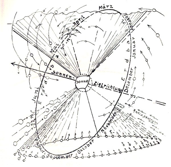 Hat sie den von anderen, großen Planeten gestörten Eiskegel zu durchfahren, so bekommt sie die Treffer nicht aus dem dann leereren Hauptkegel, sondern mehr aus dem Gegenkegel. Dann landen auf unserem Planeten, und zwar etwa Januar/Februar die ganz großen gestörten Eiskörper, im Juni spät eintreffende große, im April und Mai kleinere gestörte Körper. Ich will zunächst den