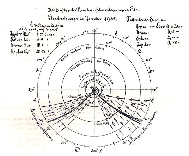 Die Jahreszeiten des Grobhagelfalles sind vorhin schon andeutungsweise gegannt; jetzt aber muß der störenden Ursachen gedacht werden. Durchfahren die äußeren großen Planeten den Eiskegel, so wirbeln sie die zur Sonne ziehenden Grobeiskörper durcheinander und fangen einen Teil davon ab. Die aus ihrer Bahn gestörten Eiskörper bilden dann den "Gegentrichter", dessen Ankömmlinge der Erde zu anderen Jahreszeiten begegnen, als diejenigen des ungestörten. Auch auf der Sonne machen sich die gestörten Eiskörper, zum Teil wenigstens, in ganz anderer Weise geltend als die ungestörten. Die Durchfahrungen der Kegelmäntel durch die Planeten, abhängig von deren heliozentrischen Längen, hat Hörbiger von 1650-1900 in Gestalt der Planetenscheibe und die Störungskurve im Vergleich mit den Wolferschen Sonnenfleckenzahlen bildlich dargestellt. Für die Voraussage des Großwettergeschehens der nächsten Jahre bringe ich zunächst die Planetenscheibe mit den heliozentrischen Längen des November 1935 (Abb. 5). ![]() Abb. 5. Daraus ist ersichtlich,
