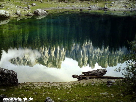 Wir richteten uns zunächst in einer kleinen Pension in dem Ort Welschnofen mit unseren beiden Reisegefährten gemütlich ein. Erwartungsvoll starteten wir gleich wieder mit dem Auto zum Karersee, der in Richtung Rosengarten liegt. Diesesmal konnten wir den Karersee und seine berühmte Spiegelung des Latemar-Gebirges in einem herrlichen Kontrast bewundern. ![]() Der Karersee