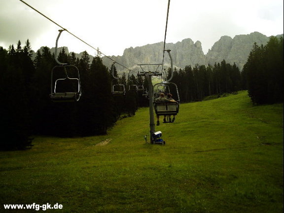 Leider konnten wir auch diesmal nicht den Rosengarten hinter dem Karersee in seiner rosigen Pracht bewundern, da das Bergmassiv mit dicken Wolken bedeckt war. Ursache für das schlechte Wetter war jedoch diesmal keine Schlechtwetterfront, sondern es waren auch über Südtirol Chemiestreifen (Chemtrails) am blauen Himmel versprüht worden, die Regenwolken erzeugt hatten. Wir begaben uns zurück in die Pension mit der Hoffnnung auf einen "sonnigen Sonntag". Am nächsten Morgen sahen wir erfreut; dass unser Wunsch erfüllt worden war: ein fast wolkenloser Himmel ließ uns das prächtige Gebirgsmassiv des Rosengartens erschauen. Nach einem kurzen Frühstück fuhren wir Richtung Rosengarten. Unterwegs genossen wir die herrliche Aussicht auf das Latemar-Gebirge. Wir entschlossen uns intuitiv, nicht schon die erste Möglichkeit für eine Bergliftfahrt auf den Rosengarten zu nutzen, sondern noch ein Stück höher zu fahren, um mit dem Laurin-Berglift direkt bis an die Stelle zu fahren, wo unserer Meinung nach einst der Rosengarten sich befunden haben könnte. ![]() Mit dem Berglift zu Laurins