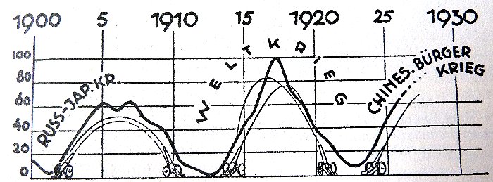 Auch die Pflanze tut es, die Jahresringe der Bäume zeigen es deutlich (Abb. 4). Bei Kulturpflanzen, deren natürliche Entwicklung vom Menschen künstlich gestört wird, treten die biologischen Entsprechungen innerhalb kurzer Spannen nicht so klar zutage. Im Großrhythmus indessen - da vermag gerade der Welteiskenner die ungemein feine Anpassung der Ernteerträge an die kosmische Harmonie festzustellen (2) (Abb. 5). ![]() Abb.