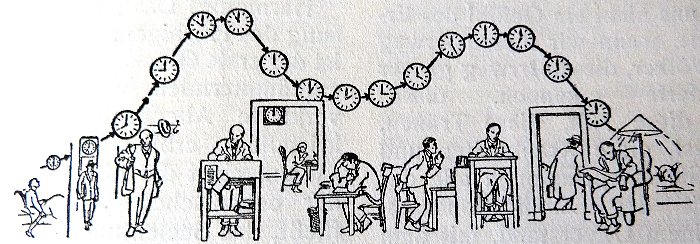 Die eingezeichneten Figuren, deren Haltung und Höhe nach dem jeweiligen Stand der geistigen Spannkraft gewählt wurden, zeigen uns bereits bei flüchtigem Blick, wie disharmonisch unsere Tageseinteilung ist. Die heute vorwiegend nachgeahmte englische Arbeitszeit von 9 Uhr morgens bis 5 Uhr nachmittags ist vollendete Disharmonie! Schon gegen 11 Uhr mittags (Tagesmulde (4)) beginnt die Spannkraft meist sehr deutlich abzusinken, um erst gegen 3 Uhr nachmittags wieder anzusteigen. Die frühere Arbeitszeit von 8-12 (7-1) und von 3-7 Uhr entspricht viel besser den natürlichen Notwendigkeiten, sie dürfte infolge ihrer harmonischen Gestaltung auch ein durchschnittlich besseres Arbeitsergebnis gezeitigt haben als die (an sich bequemere) englische Arbeitszeit. Ein dickes Buch wäre